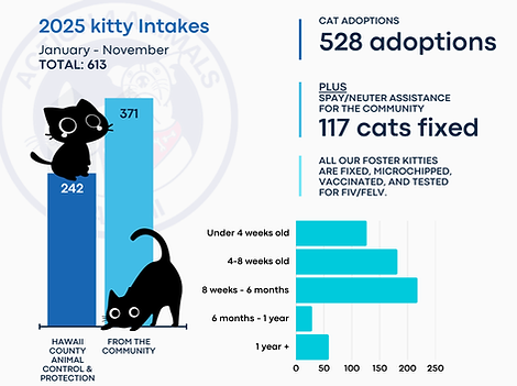 Action 4 Animals Hawaii is foster-based on the east side of Hawaii Island, but we ALWAYS have kittens at Hilo Petco in the cubbies, available for adoption any time Petco is open. We also have monthly adoption events for both cats and dogs.